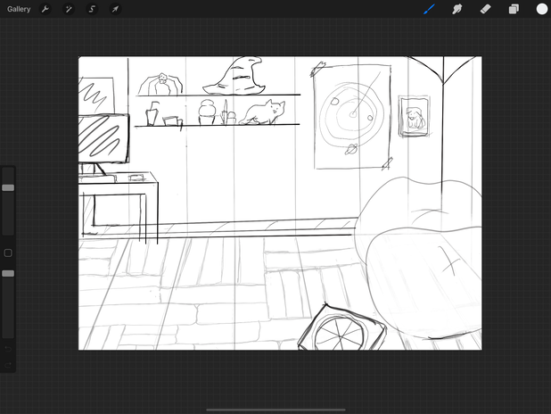 These are the backgrounds I have painted in ProCreate (iPad) using Adventure time's colour palates and drawing style for inspiration. I found that it was difficult to create the right perspective in advance for my characters due to my uncertainty of how they would be animated. As I have now decided on using Adobe Character Animator for most of the scenes I know that the characters will be staged in a foreground/midground position speaking towards the camera as opposed to walking through a scene (Once I am able to achieve this kind of animation well I would like to use it but currently I don't have the software know-how. I based Andrew and Garrett's home on elements of 'dream homes' they have spoken about liking (Spooky tower, fire pit, nature, modern touches).